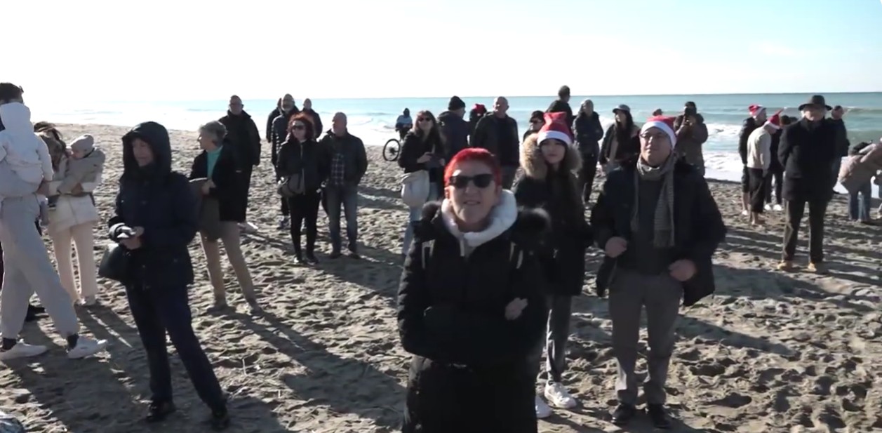 Il ritrovo, fissato alle 10 al Bagno Stella Sud, ha registrato un’ottima affluenza, con decine di partecipanti. La bella giornata di sole ha reso l’atmosfera più accogliente, attenuando il freddo per i coraggiosi tuffatori. Alle ore 11.00 è partito il countdown ufficiale, guidato dalla maschera rionale “Gambe di Merlo”, che ha accompagnato i partecipanti sulle note del “Nessun Dorma” di Giacomo Puccini.